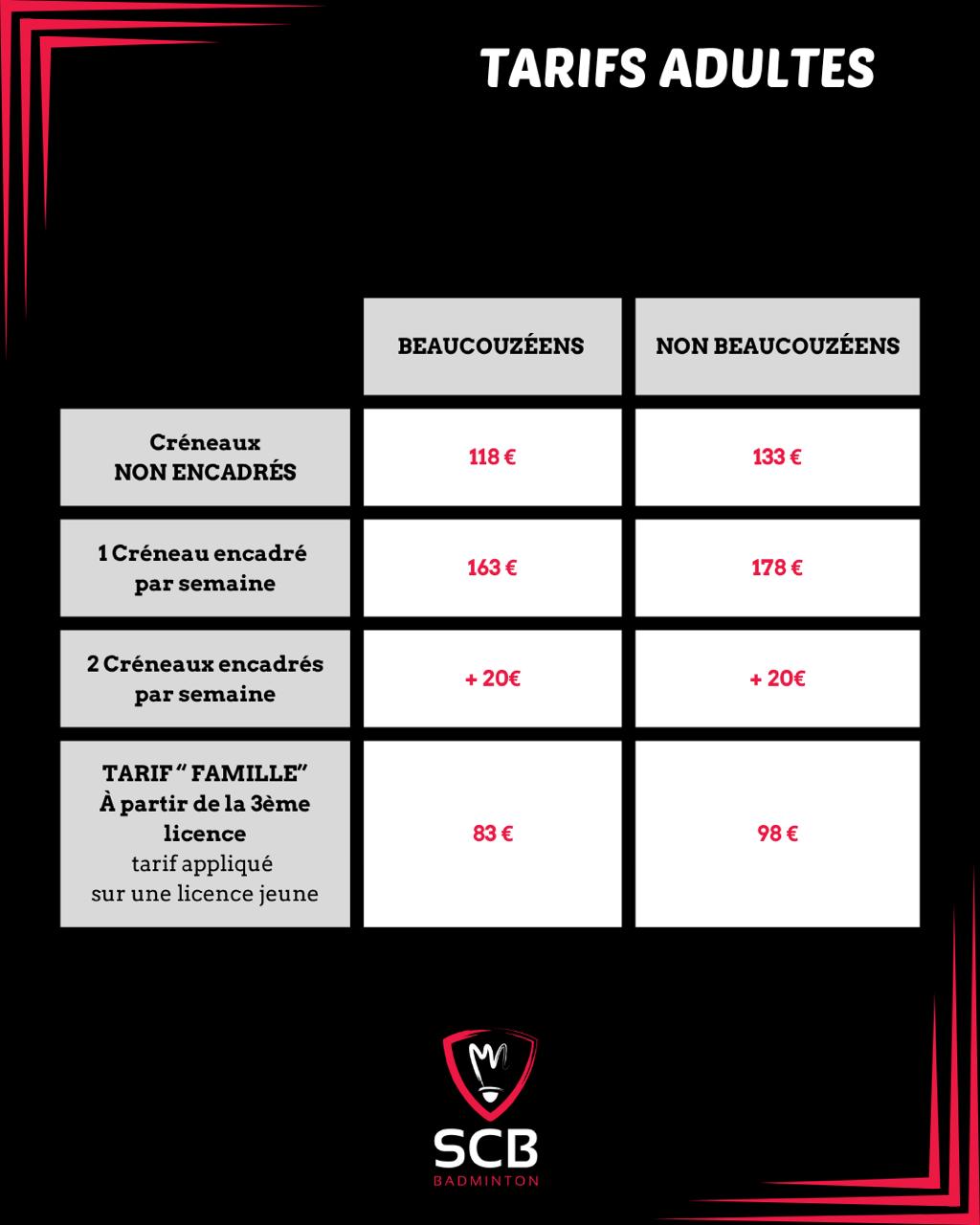 Tarifs Adultes